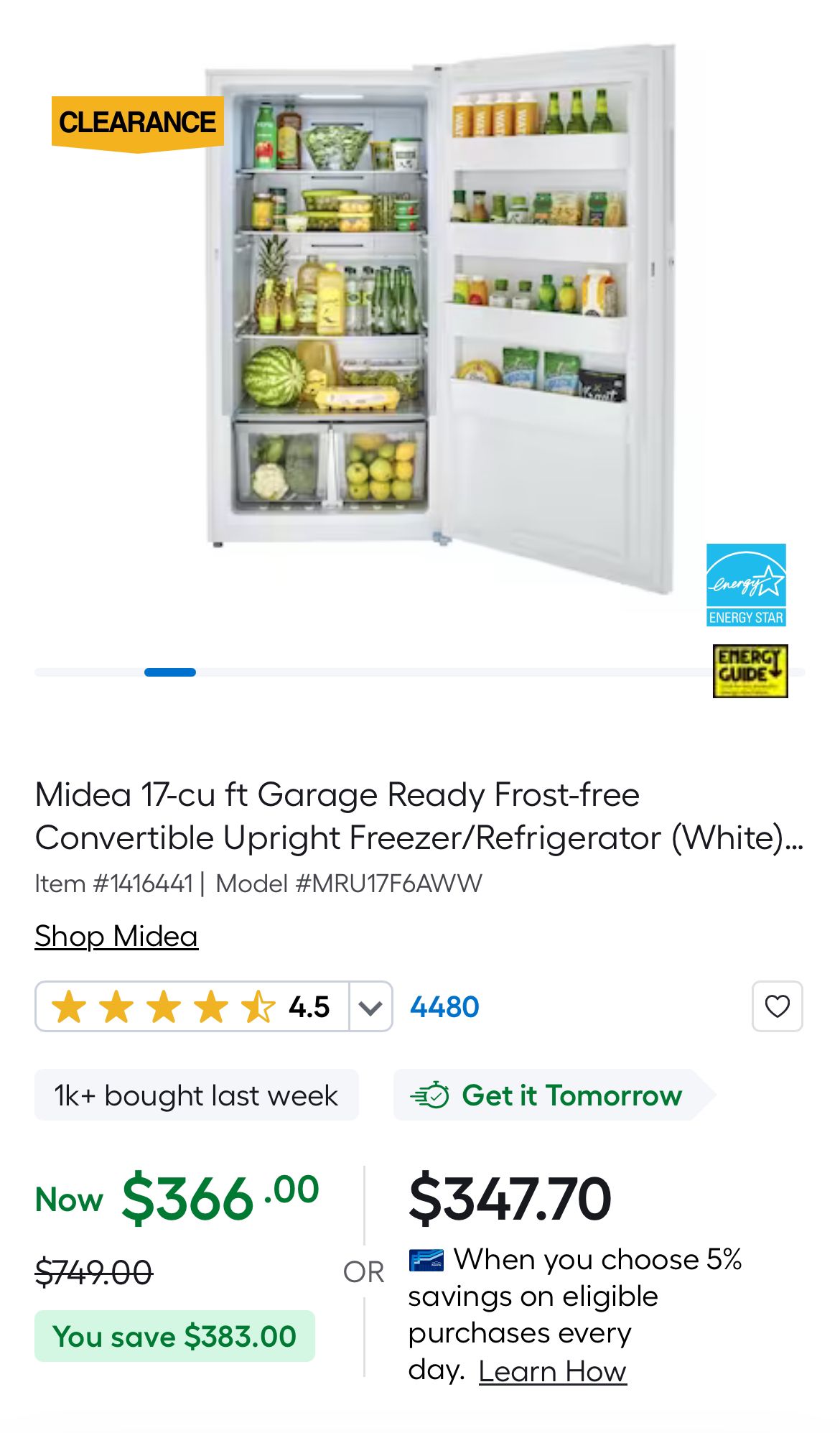 Midea 17-cu ft Garage Ready Frost-free Convertible Upright Freezer/Refrigerator Just $366!