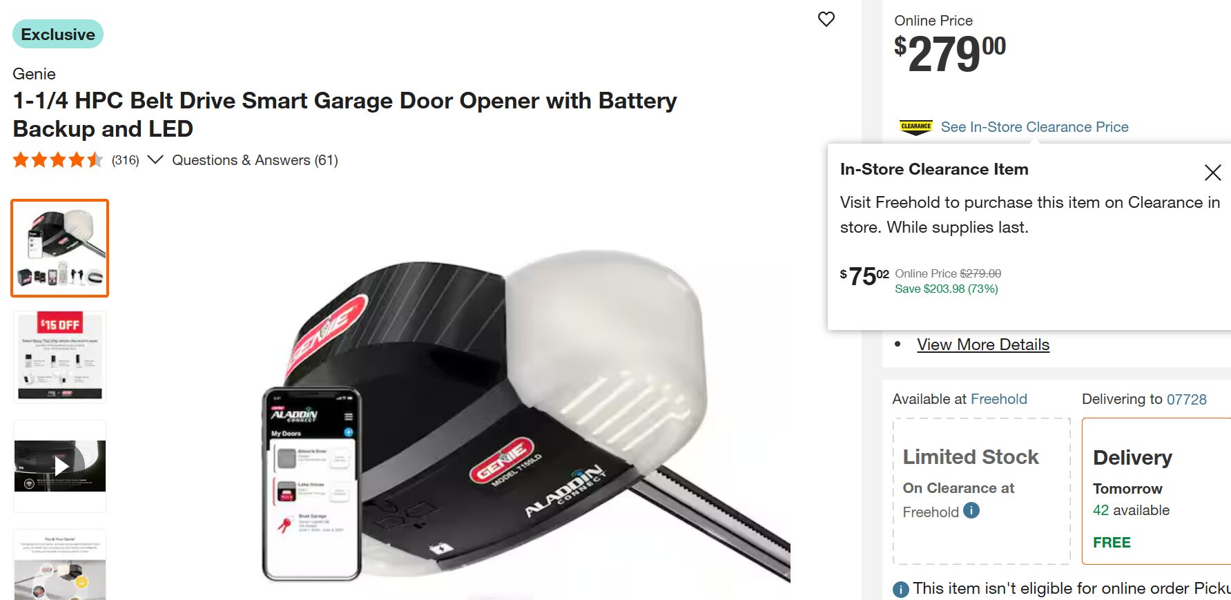 Home Depot In Store Clearance Only! 1-1/4 HPC Belt Drive Smart Garage Door Opener with Battery Backup and LED Just $75.02 (Was $279)