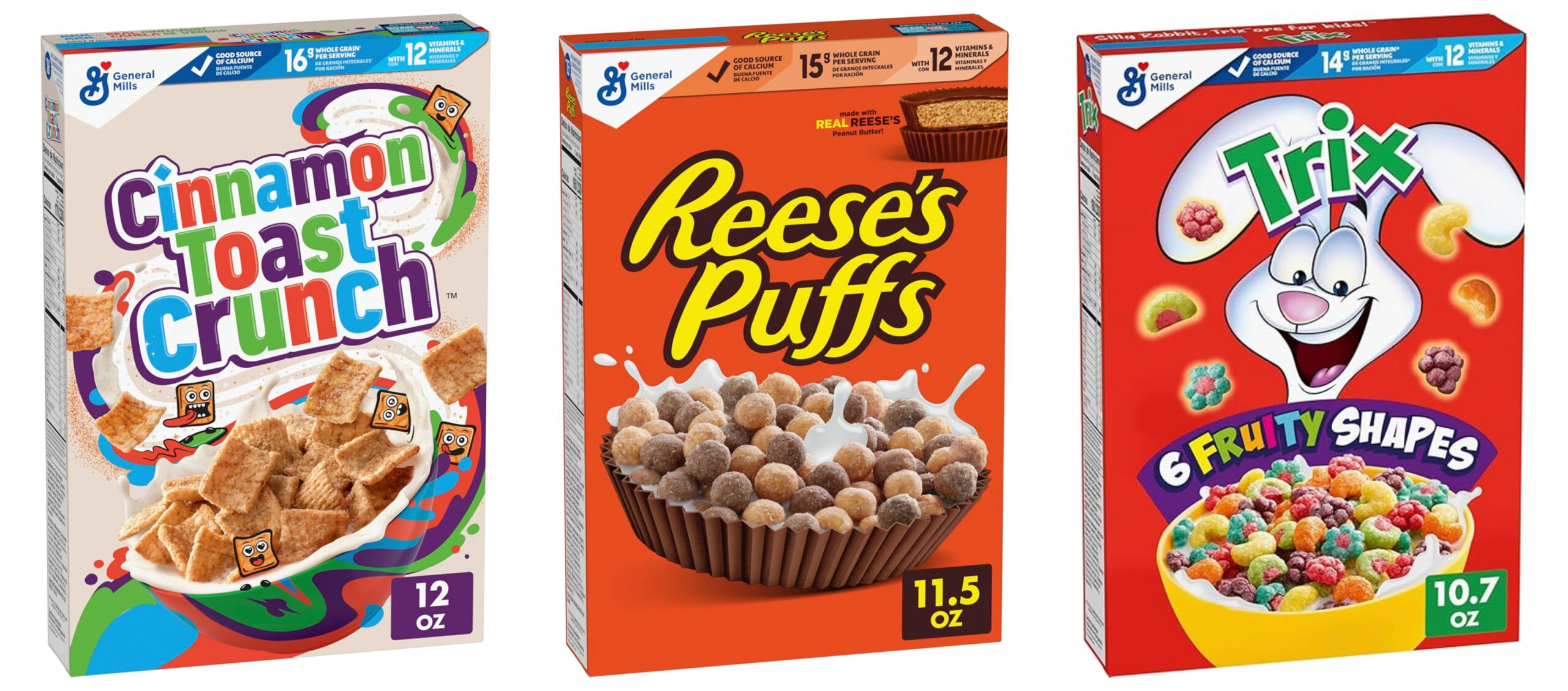 Cheerios, Honey Nut Cheerios, Reese’s Puffs, Cinnamon Toast Crunch, & Trix!